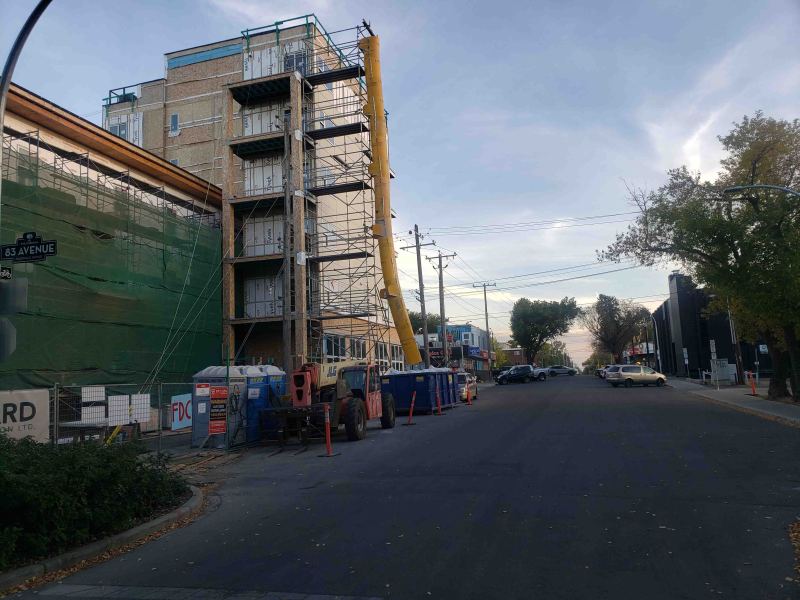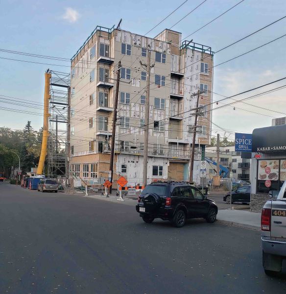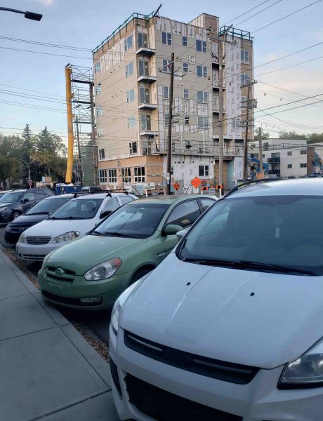 While not my ward, this building in Old Strathcona at 83rd Avenue and 108 Street is, unfortunately, in my city. I used to live in the apartment building next door, where a complimentary parking space was provided. This new development, runs the building to the very edge of the alley, with no setbacks and no provision for parking or even a place for garbage bins. This has to stop! See the gallery of photos with my comments.